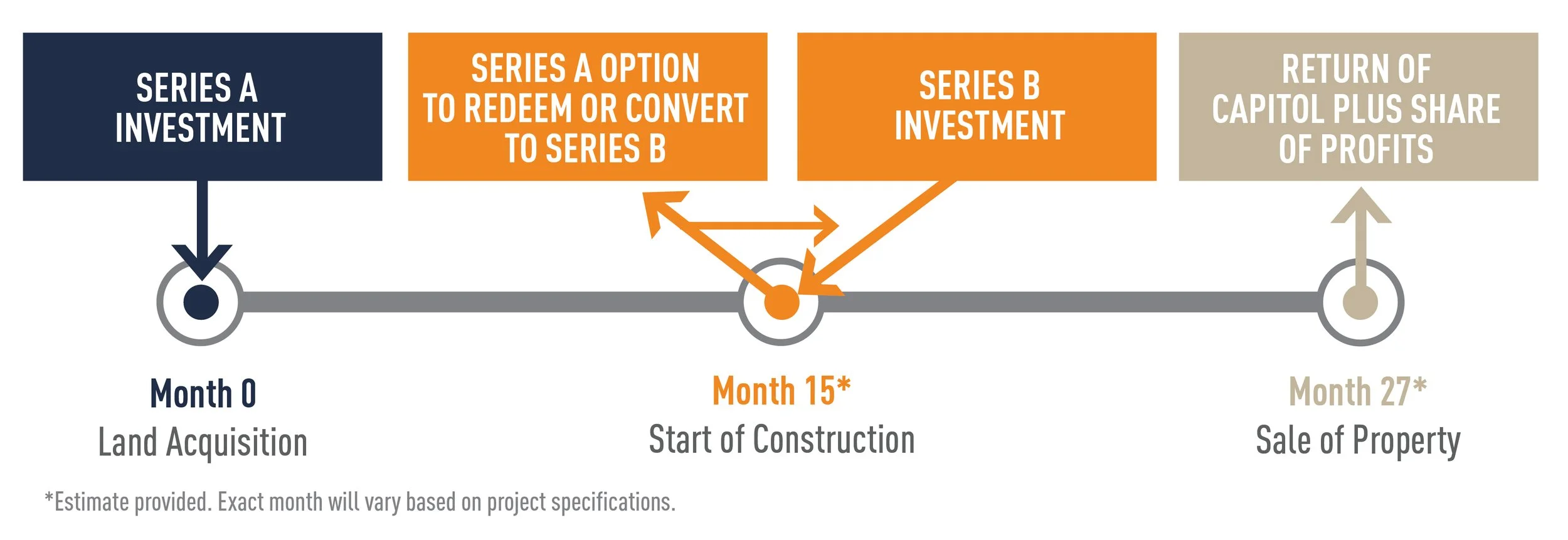 Throughout the lifecycle of a project, we offer two opportunities to invest: Series A and Series B. Series A investors will invest at the beginning of the deal during the land acquisition phase. The money invested goes towards purchasing the land and covering pre-construction costs such as design fees, civil engineer fees, permitting fees, etc. The typical lifespan of this Series A investment is roughly 12 - 18 months depending on the project. At the end of this investment period, which is concurrent with the start of construction, Series A investors receive a preferred return on their investment. At this time, Series A investors are given two options. They can either liquidate, and will receive their initial investment back along with the preferred return. Or, they are given the option to convert their investment plus their preferred return into Series B.