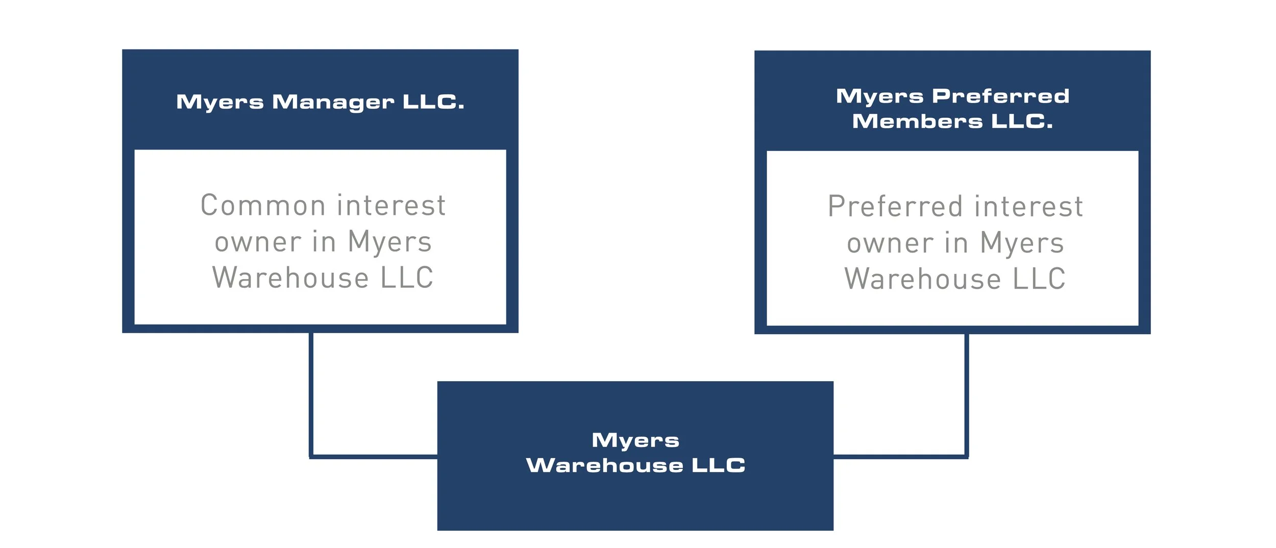 Myers Warehouse LLC is the operating entity that receives the equity investment from Myers Preferred Members LLC. This entity holds title to the real estate asset. Its role is to execute the development project and to design, permit, build and lease or sell the project. This entity pays a share of the project profits and management fees to Myers Manager and also pays a share of profits and return of invested capital to Myers Preferred Members LLC. This entity’s operating agreement outlines the waterfall profit split structure for sharing profits between the preferred member and the common member interests.